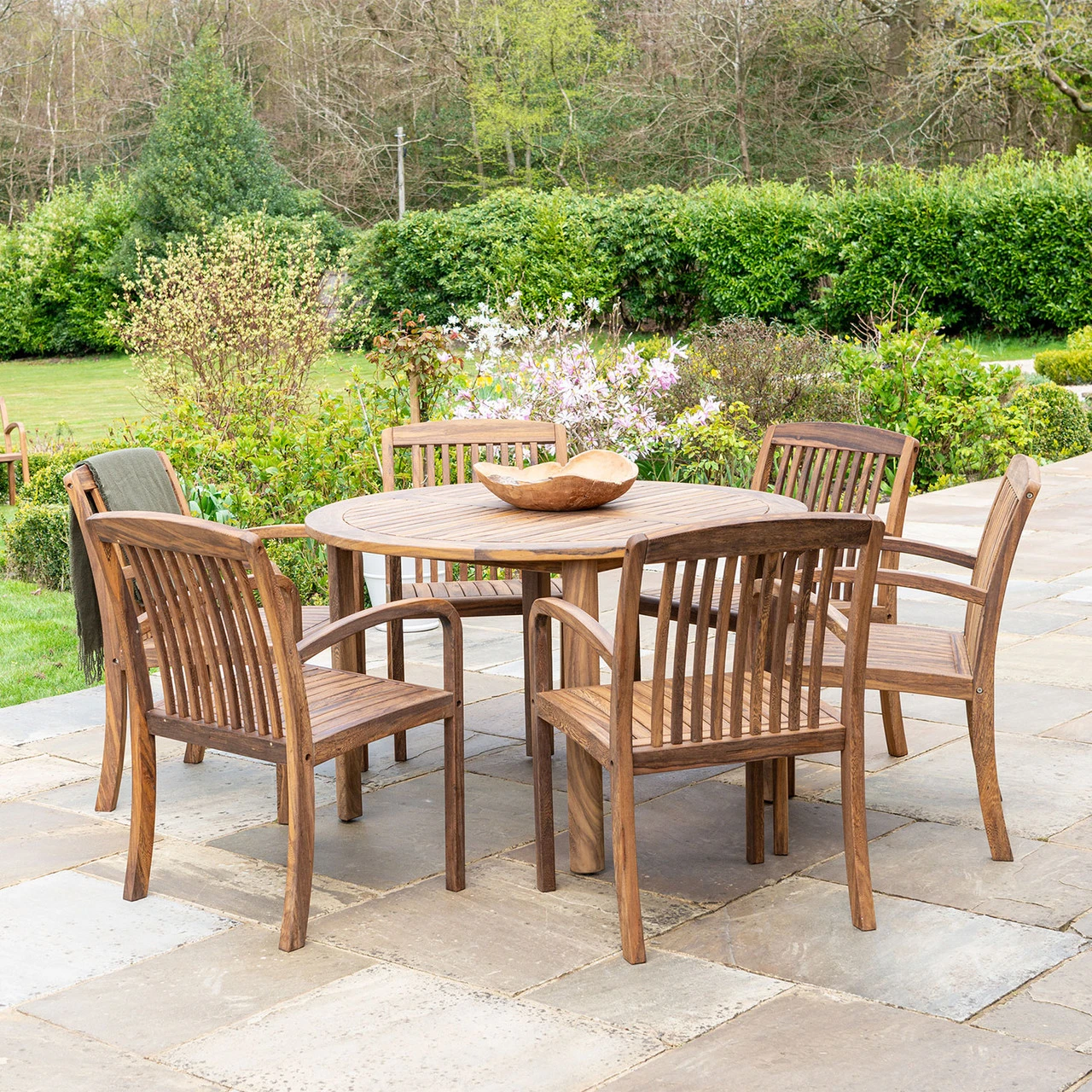 Round tables are made for socialising and this set comes with a 1.3m one which will comfortably sit up to 6 people. The set is made from strong Acacia timber which is a rich brown colour, complete with a smooth, sanded finish which enhances the natural marbled grain. The durability of this timber is comparable to that of teak – so you can be confident it’ll last you many years to come, even with the good old English weather. You can use Alexander Rose’s Timber Treatment Plus to help retain the colour and Timber Sealer for protection from food and drink stains, as well as water ingress. As with all products in the Alexander Rosee Bolney range, this also comes with a 5 year warranty.