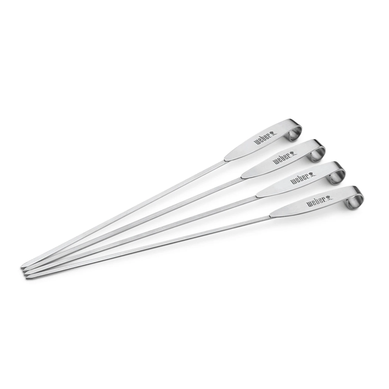 This is set of 4 Weber® skewers which are made from stainless steel and has the weber® logo and iconic kettle at the end of them.